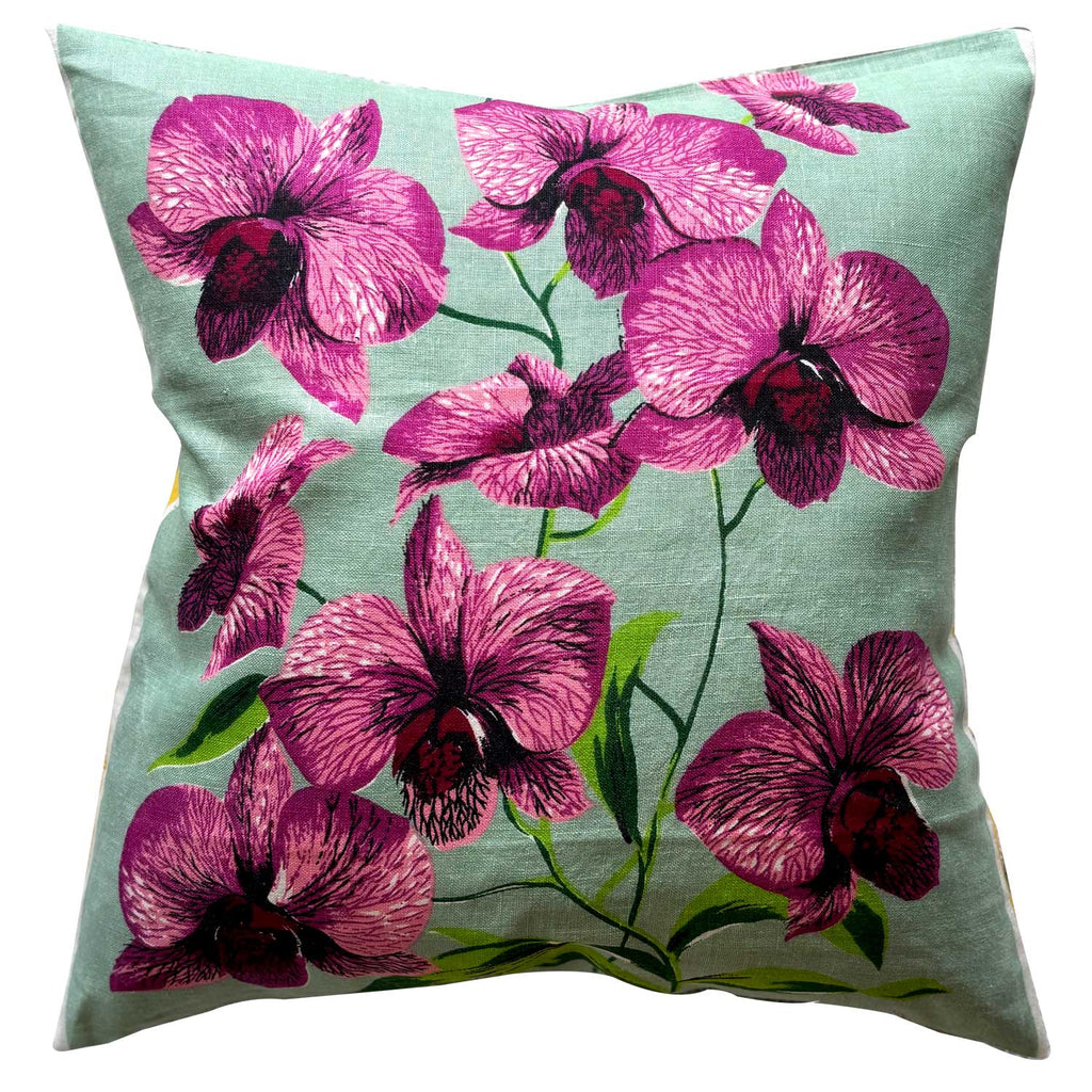 How lovely is this dramatic and beautiful Cooktown Orchid vintage linen teatowel cushion cover? A rich black background contrasts with the pink-toned orchids beautifully.